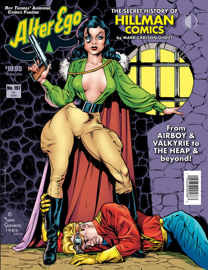 Alter Ego #197 presents the incredible inside story of HILLMAN PUBLISHING—1940 to 1953—by MARK CARLSON-GHOST! Thrill to the adventures of AIRBOY—aviatrix VALKYRIE—THE HEAP—SKYWOLF, et al.! With classic art by KIDA, SCHROEDER, LEAV, INFANTINO, ZOLNEROWICH, and some of comics’ finest artists! Plus FCA (Fawcett Collectors of America) and MICHAEL T. GILBERT visits Mr. Monster’s Comic Crypt! Featuring a stunning Valkyrie/Airboy cover by DAVE STEVENS! Edited by ROY THOMAS.