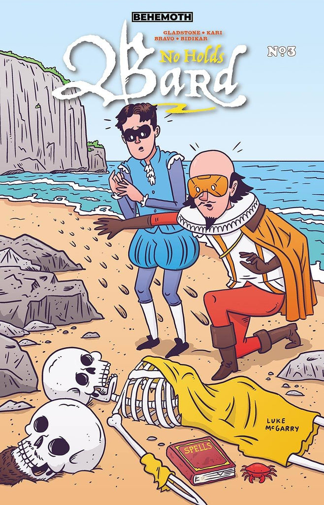 The iambic adventures continue as The Dramatic Duo are shipwrecked on a magickal island of mystery and enchantment. Bard and Page are tested against the elements and each other! Can Caliban convince them to use art most foul? Will they ever see jolly ol' England again? Find out in No Holds Bard Issue #3: The Trouble with Tempests!
